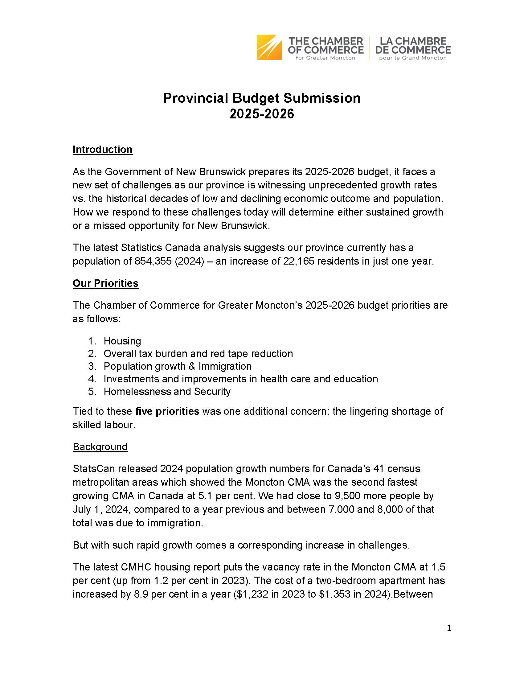 • The Chamber has been listed as the lead of supporting stakeholder in 16 action items in both the Greater Moncton Immigration Strategy and the Southeast Regional Workforce Strategy.