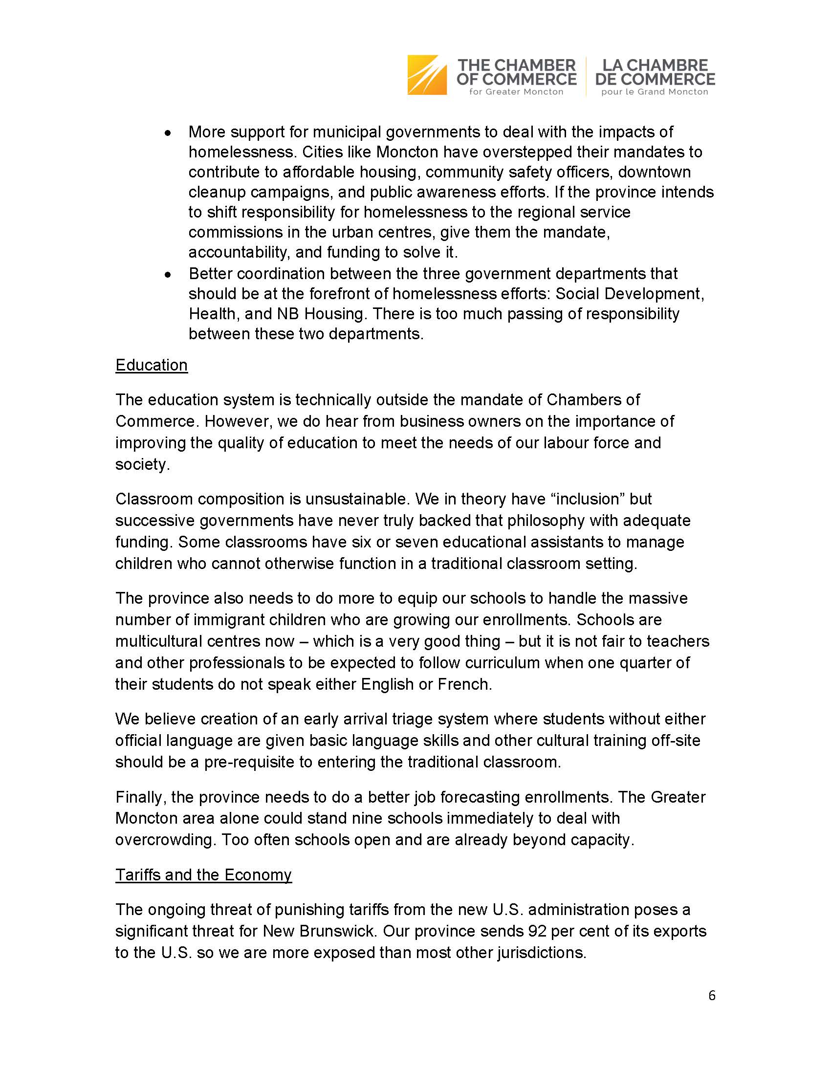 Multiple members of the Chamber, and other business owners in our three communities, have identified homelessness and security as the #1 issue our municipalities need to focus on. Members and other business owners are facing theft and vandalism on their property or near their businesses. More police presence is requested in the three municipalities, especially in downtown Moncton. The number of individuals experiencing homelessness doubled in the past year with now 300 individuals identified.