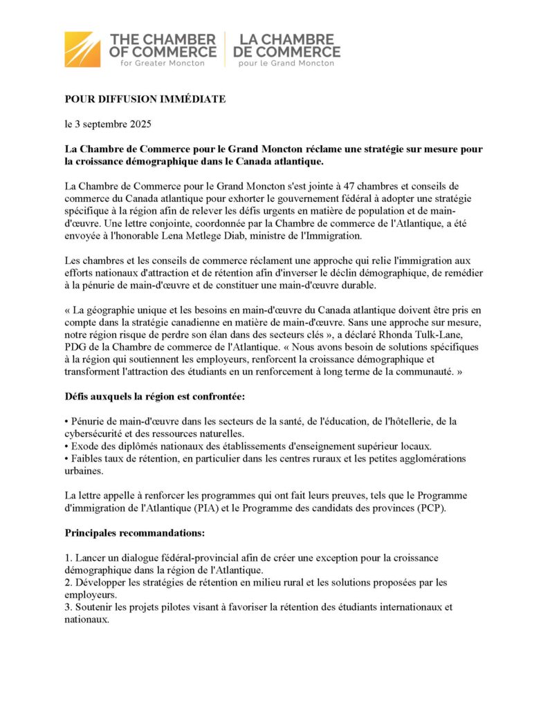 La Chambre de Commerce pour le Grand Moncton réclame une stratégie sur mesure pour la croissance démographique dans le Canada atlantique